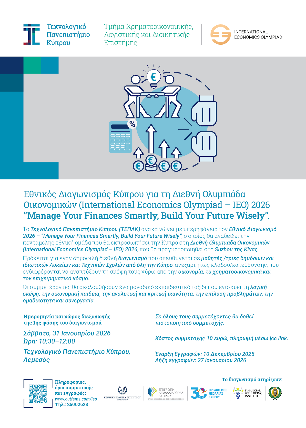 Το Τεχνολογικό Πανεπιστήμιο Κύπρου (ΤΕΠΑΚ) ανακοινώνει με ιδιαίτερη χαρά και υπερηφάνεια τον Εθνικό Διαγωνισμό 2026 «Manage Your Finances Smartly, Build Your Future Wisely». Ο διαγωνισμός αποτελεί την τρίτη εθνική διοργάνωση που θα αναδείξει την πενταμελής ομάδα η οποία θα εκπροσωπήσει την Κύπρο στη Διεθνή Οικονομική Ολυμπιάδα (International Economics Olympiad – IEO) 2026, η οποία θα πραγματοποιηθεί στο Suzhou της Κίνας.
